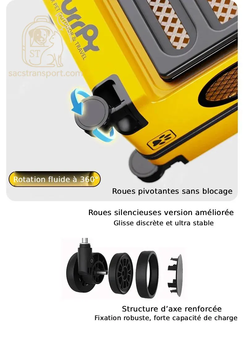 De plus le bruit est souvent une source d’angoisse pour les animaux. Avec ses roulettes ultra-silencieuses, cette valise de transport chat minimise les nuisances sonores, rendant vos trajets plus agréables pour vous et votre compagnon. Dans les gares ou les aéroports, ce détail devient un atout précieux pour voyager sans stress.